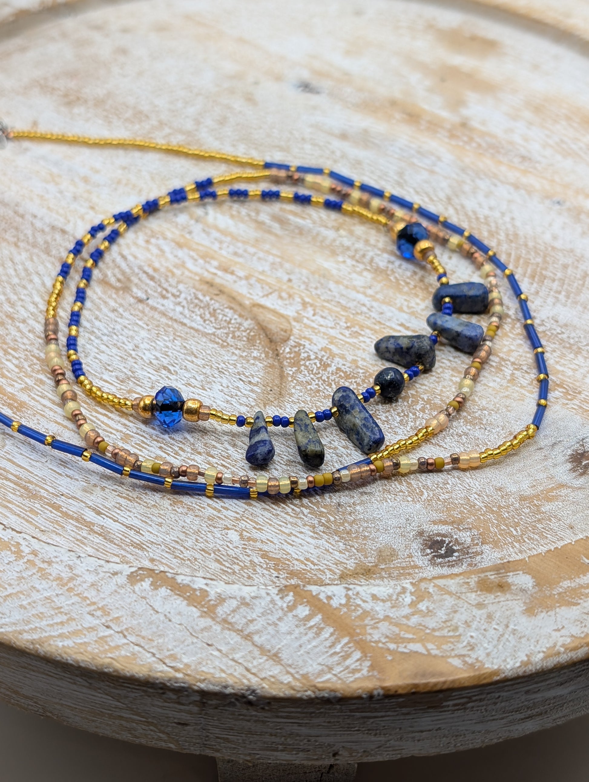 Lapis Lazuli is known as the stone of inner wisdom, confidence, and divine truth. It helps open the Third Eye, deepens intuition, strengthens communication, and supports emotional healing. Wearing it around the waist helps you stay aligned, honest with yourself, grounded in your power, and connected to your inner voice.